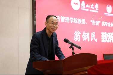 翁钢民教授代表王海军校友授业恩师致辞。他深情回顾了王海军在校求学时的点滴,赞扬了王海军在成就事业的路上用实际行动持续反哺母校。