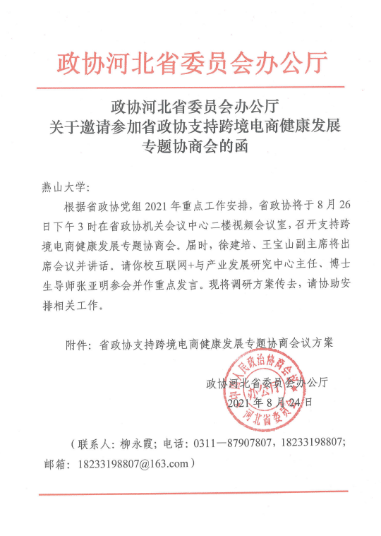 8月26日,省政协支持跨境电商健康发展专题协商会在石家庄召开。省政协副主席徐建培,省政协常委、港澳台侨和外事委员会主任安国富,省政协常委、民建河北省委专职副主任范社岭等出席会议。民建省委委员、宝威体育电子商务系张亚明教授受邀代表民建河北省委参加会议。