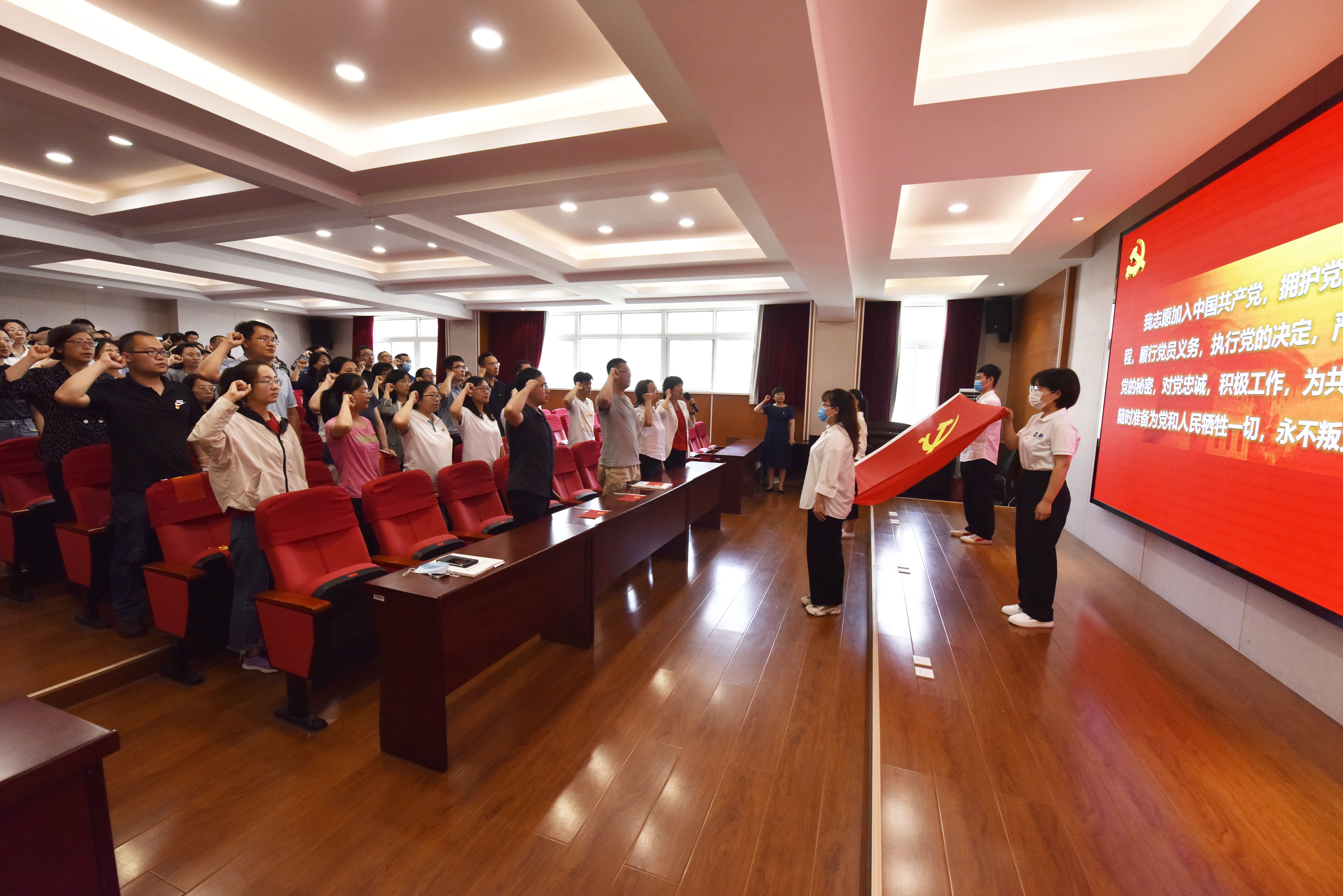 党龄最长的臧秀清同志带领下庄严宣誓:“我志愿加入中国共产党……随时准备为党和人民牺牲一切,永不叛党。”铿锵有力的宣誓声回响在报告厅,一字一句,神圣而豪迈;铮铮誓言,坚定了全体党员全心全意为人民服务,努力成为担当重任的时代新人的初心和使命。