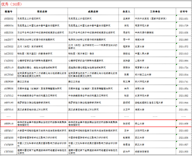 张亚明教授主持完成的国家社会科学基金规划项目“非传统安全事件虚实耦合互动的网络群体集聚舆情传播研究(18BXW118)”结题鉴定结果为“优秀”等级。这是继张亚明教授研究团队刘海鸥副教授4月份获得我校第一个国家社科基金结题“优秀”后的又一突出成果,张亚明教授也成为我校第一个国家自然科学基金与国家社会科学基金均获得立项且结题都为“优秀”的科研人员。