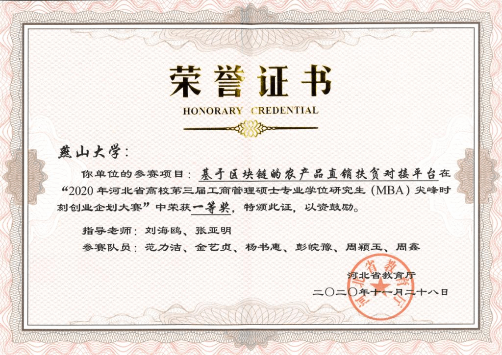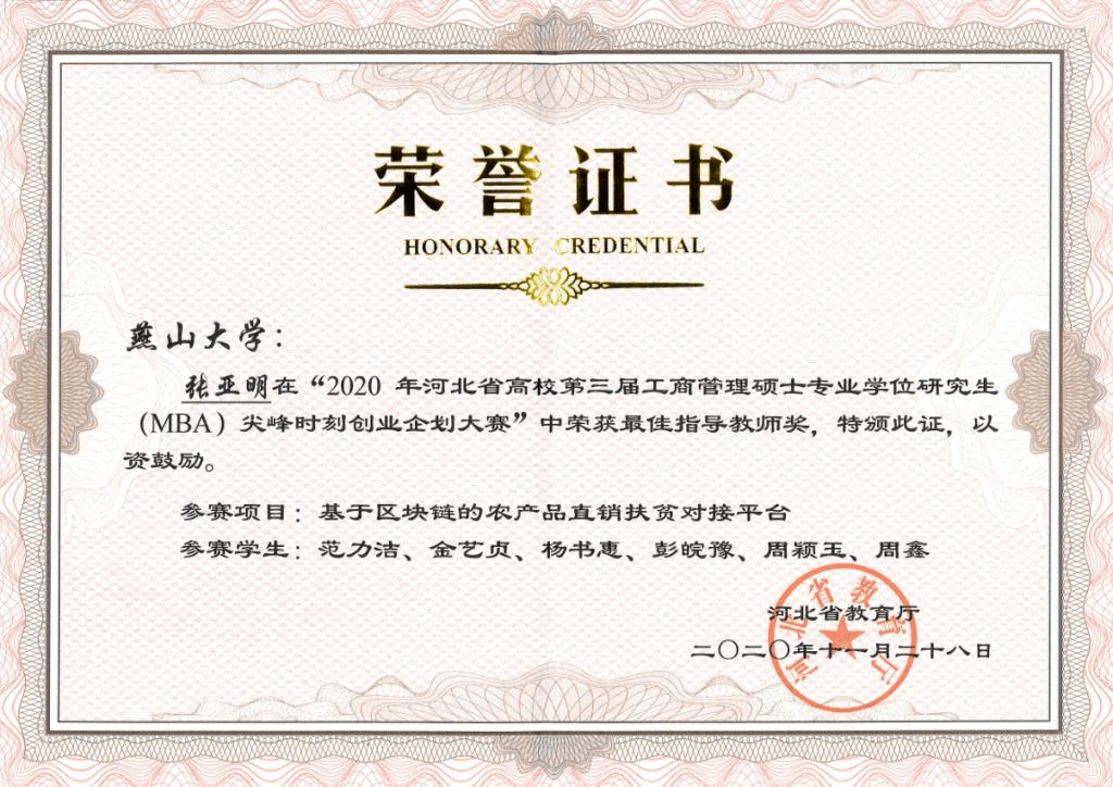、河北工业大学、河北大学、河北科技大学、河北师范大学等10个高校的53支队伍的报名参赛,最终18支参赛队晋级决赛。决赛采用了“线上+线下”的形式举办。经过决赛队伍的精彩展示,评委老师综合各参赛团队的商业计划书和现场展示,评定出了本次比赛的获奖项目。我校张亚明教授、刘海鸥副教授指导的《基于区块链的农产品直销扶贫对接平台》荣获一等奖,许孝君副教授指导的《小象无忧-求职合租找室友》、王宏艳副教授指导的《云“智”愿——高考志愿填报行业引领者》获得二等奖,陈晶璞教授指导的《倾心家庭服务APP》、王玖河教授指导的《基于51单片机的光伏智能养花系统》、许孝君副教授指导的《南平市红色研学旅游产品设计与开发》获得三等奖。张亚明教授获得比赛最佳指导教师奖。