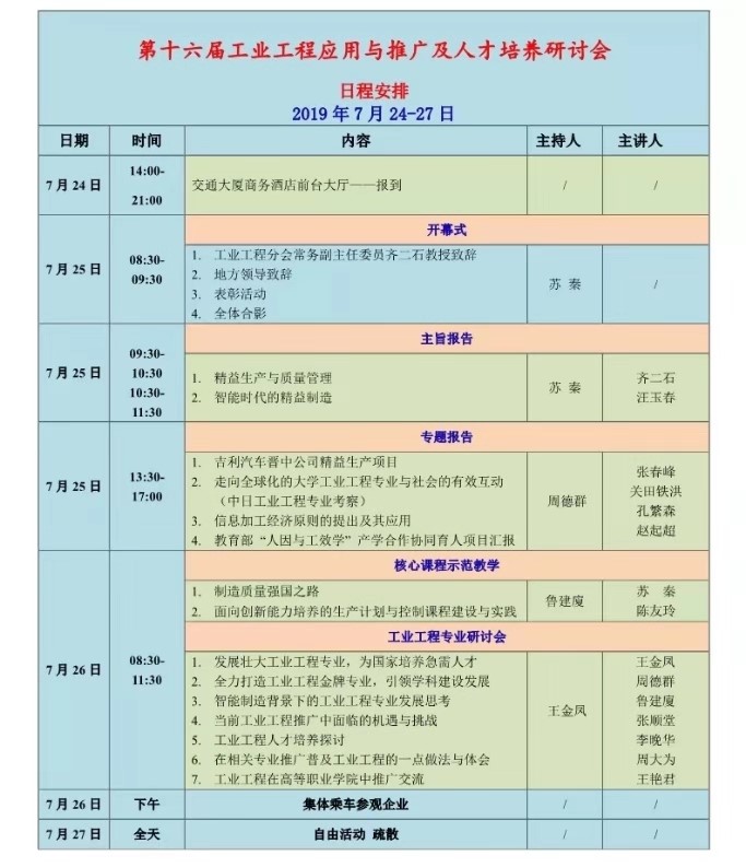 本次培训共两天,其中7月25日一个会场做7次专题讲座,7月26日分两个会场分别进行IE核心示范课程教学讲座和工业工程专业学科建设和人才培养研讨会。本人参与了25日全天的讲座和26日工业工程学科建设和人才培养研讨会的内容。会议主要日常安排如上图所示。