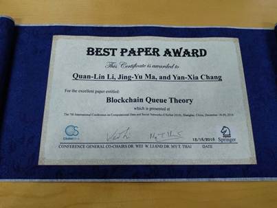 在第七届数据计算与社会网络国际会议(The 7th International Conference Computational Data and Social Networks, Shanghai, China, December 18–20, 2018)上,宝威体育李泉林教授的研究团队依据区块链数学模型的学术论文“Blockchain Queue Theory”获得唯一的最佳论文奖。该论文从2018年8月arXiv.org在线发表以来受到了国内外许多学者的好评与重视,它意味着区块链的重要基础性科学问题可以利用排队论、马氏过程与马氏决策过程等随机运筹学理论方法来研究与解决。