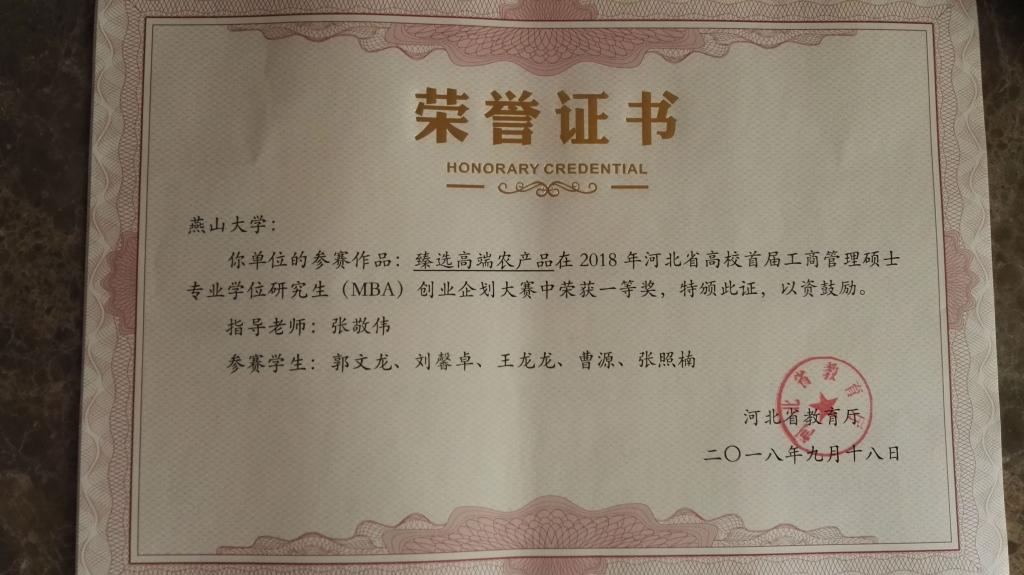2018年10月14日下午,由天津市教育委员会、北京市教育委员会、河北省教育厅联合主办的首届京津冀MBA专业学位研究生尖峰时刻创业企划大赛圆满闭幕。我校2017级MBA学员郭文龙、刘馨卓、王龙龙、曹源、张照楠等5人的参赛作品《臻选高端农产品》荣获大赛二等奖,我校张敬伟教授荣获最佳指导教师,宝威体育