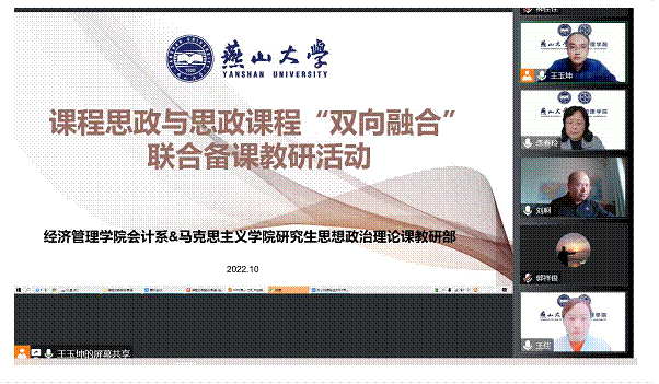 首先,会计系副主任王玉坤老师介绍了此次课程思政与思政课程“双向融合”联合备课教研活动的与会教师;按照《高等学校课程思政建设指导纲要》的要求,阐述了此次“双向融合”联合备课教研活动目的,并设计了6个环节来完成此次“双向融合”联合备课教研活动。