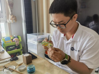在卢老师的悉心指导下,队员们认真学习雕刻皮影的手艺。从绘制影谱到蜡版雕刻,从上色装订再到清漆涂刷,每一个步骤都需小心进行。在雕刻过程中,有的队员雕刻皮影磨破了手,包上创可贴继续拿起刻刀;有的保持一个姿势上色,久了腰酸背痛,但仍坚持把工作做完。功夫不负有心人,队员们最终成功制作出属于自己的作品。