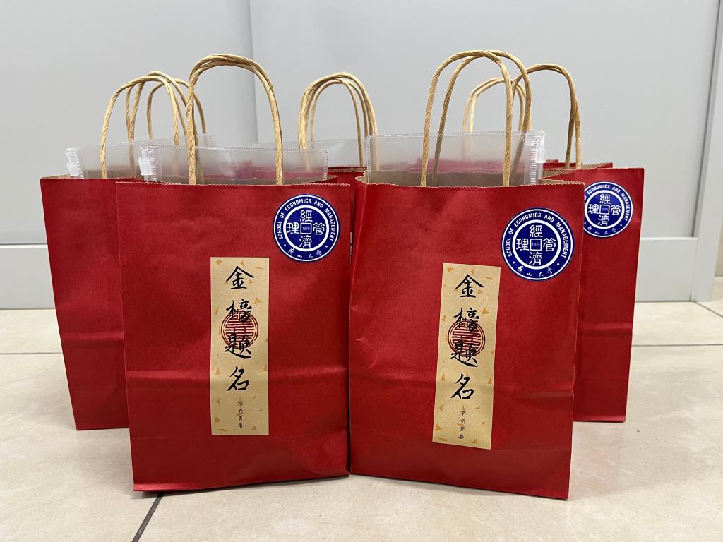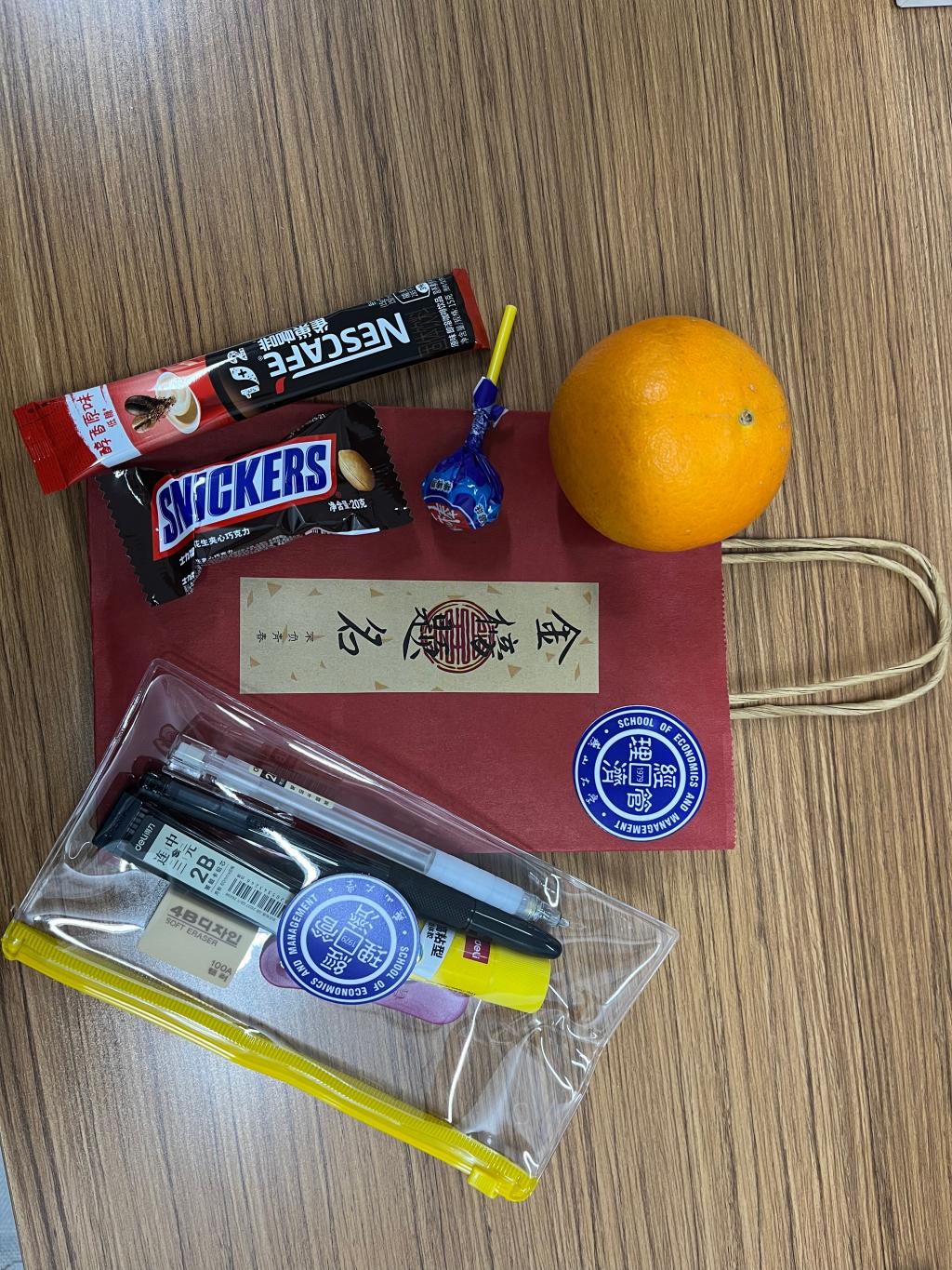 小小的礼包,大大的祝愿。红色的手提袋上印着“金榜题名”,装有寓意全力以赴,考“士”顺利的士力架、寓意“棒”上有名的棒棒糖、寓意“啡”你莫属的咖啡以及代表“橙”功上岸的橙子和考试必备文具包。