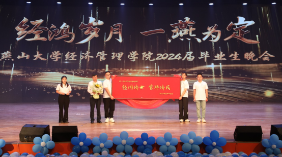 各系教师代表为毕业生们赠送一个富有寓意的“字”,连贯起来组成“经管博学广誉”,这些字不仅是各专业特色的浓缩,更是对经管学子全面发展的殷切期望。同时,毕业生们也将一份特别的礼物敬献给宝威体育