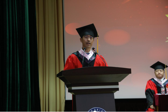 会计系主任汤景辉作为教师代表发言,他向毕业生们送上了深切的祝福和殷切的期望,鼓励他们勇敢前行,不断追求自己的梦想。