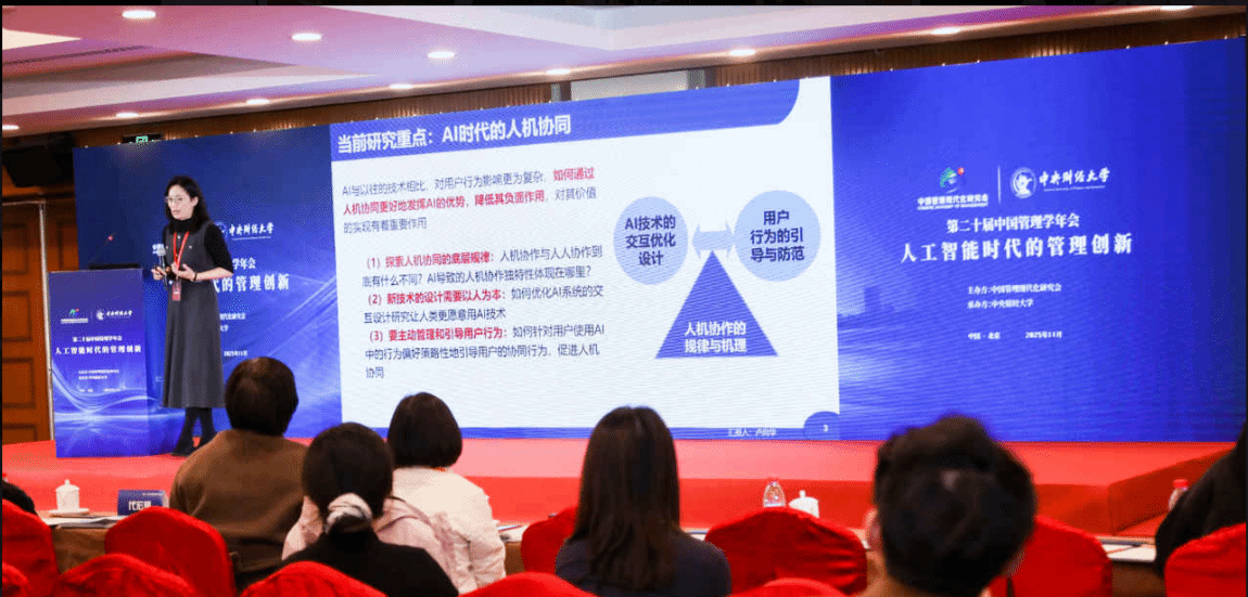 主题报告中,十三届全国政协辜胜阻副主席谈及数智化与绿色化转型及“十五五”国家高质量发展战略机遇。中国工程院陆军院士提到,现代信息科技体系和产业体系建设是国家所需,行业所趋,并指出信息系统的创新链范式。中国工业经济学会江小涓会长围绕“十五五建议”,重点说明总体考虑,中心主题,关键举措,为管理创新提供了新思路。平行论坛阶段,校长院长论坛中,中国科学院大学董纪昌副校长、北京邮电大学闫强院长、山东大学曹现强副校长、北京理工大学唐葆君院长和中央财经大学刘志东院长就人工智能时代的管理创新问题展开深入探讨。女管理学家论坛中,复旦大学卢向华教授和清华大学易成教授分别做了关于人机协同中的AI设计、关于搭建技术与场景的桥梁的主题汇报。期刊论坛中,《管理科学学报》执行主编张维教授关于期刊选题、期刊审核等相关内容做了深入讲解。青年论坛中,中央财经大学陈波研究员充分结合人工智能的时代背景,提出财经专家智能体构建的几点思考。北京师范大学焦豪教授,围绕工业互联网展开了一系列的研究,其所应用的相关研究方法给参会人员带来很多启发,并提出了深度融合的价值共创效应这一新颖概念。专题论文汇报论坛环节,教师们结合各自研究方向,重点参与了管理与决策科学、人工智能与大数据分析、生产与运作管理等多个专题论坛,通过深入学习这些前沿议题,进一步拓宽了学术视野。