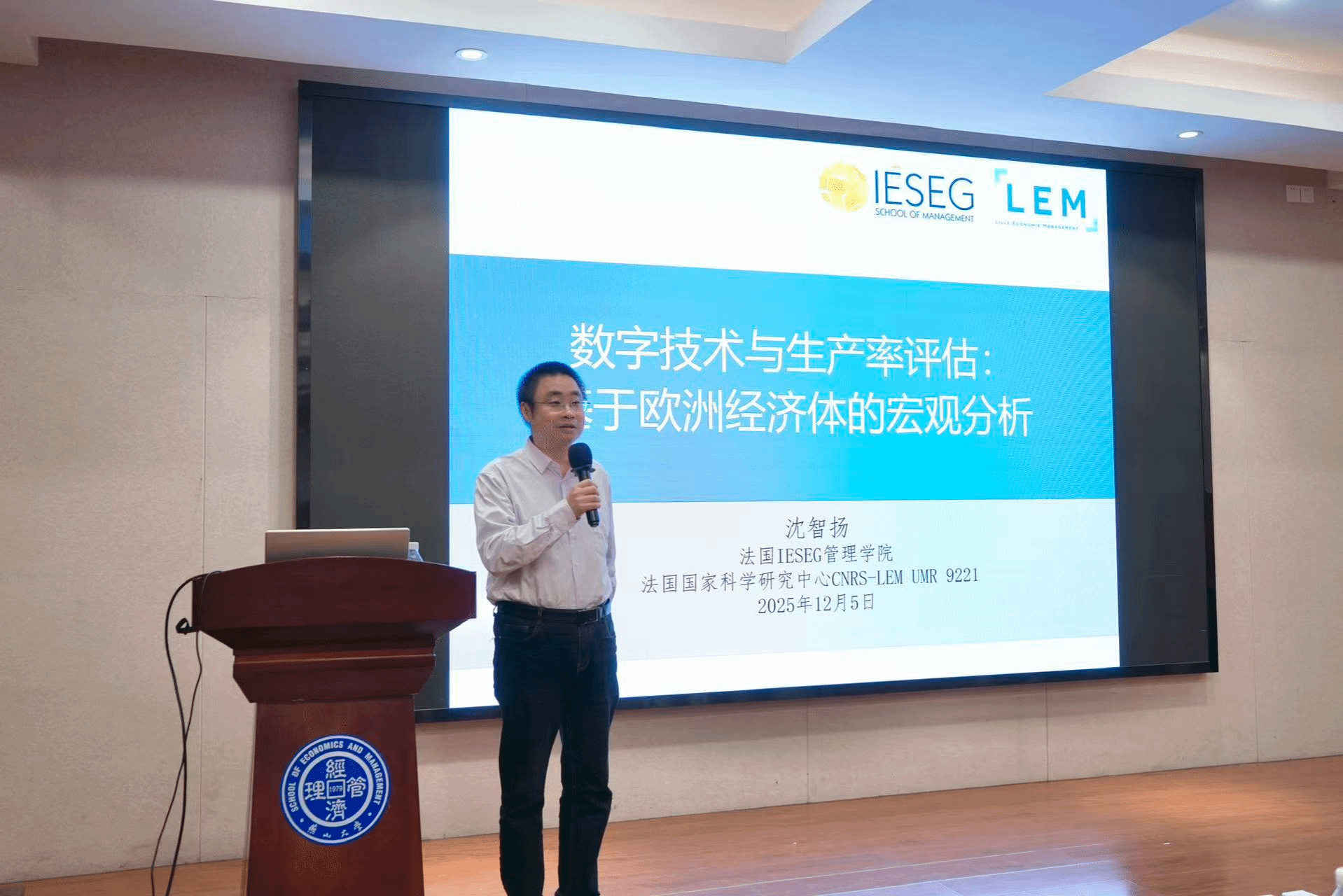 在经管楼A218举办“周末专家河北行”暨“燕山大讲堂”系列学术活动。IESEG管理学院沈智扬受邀作题为“数字技术和生产力评估——欧洲经济体的宏观分析”的学术报告。学院相关教师及研究生六十余人参加本次活动。本次报告由宝威体育