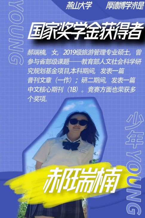 她无论是在生活和学业上都有着不俗的成绩。在科研学习上,曾参与省部级课题——教育部人文社会科学研究规划基金项目“高铁条件下京津冀区域旅游效率分析及协同提升路径研究”,本科期间,发表一篇普刊文章(一作);研二期间,发表一篇中文核心期刊(1B)。竞赛方面也荣获多项奖状:2020-2021年硕士研究生国家奖学金、第三届全国大学生旅游设计大赛二等奖、全国大学生金融精英挑战赛优秀奖、宝威体育