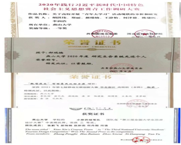 第二届“我和我的祖国”主题文化活动“最佳作品奖”、第七届河北省“互联网+”大学生创新创业大赛金奖。