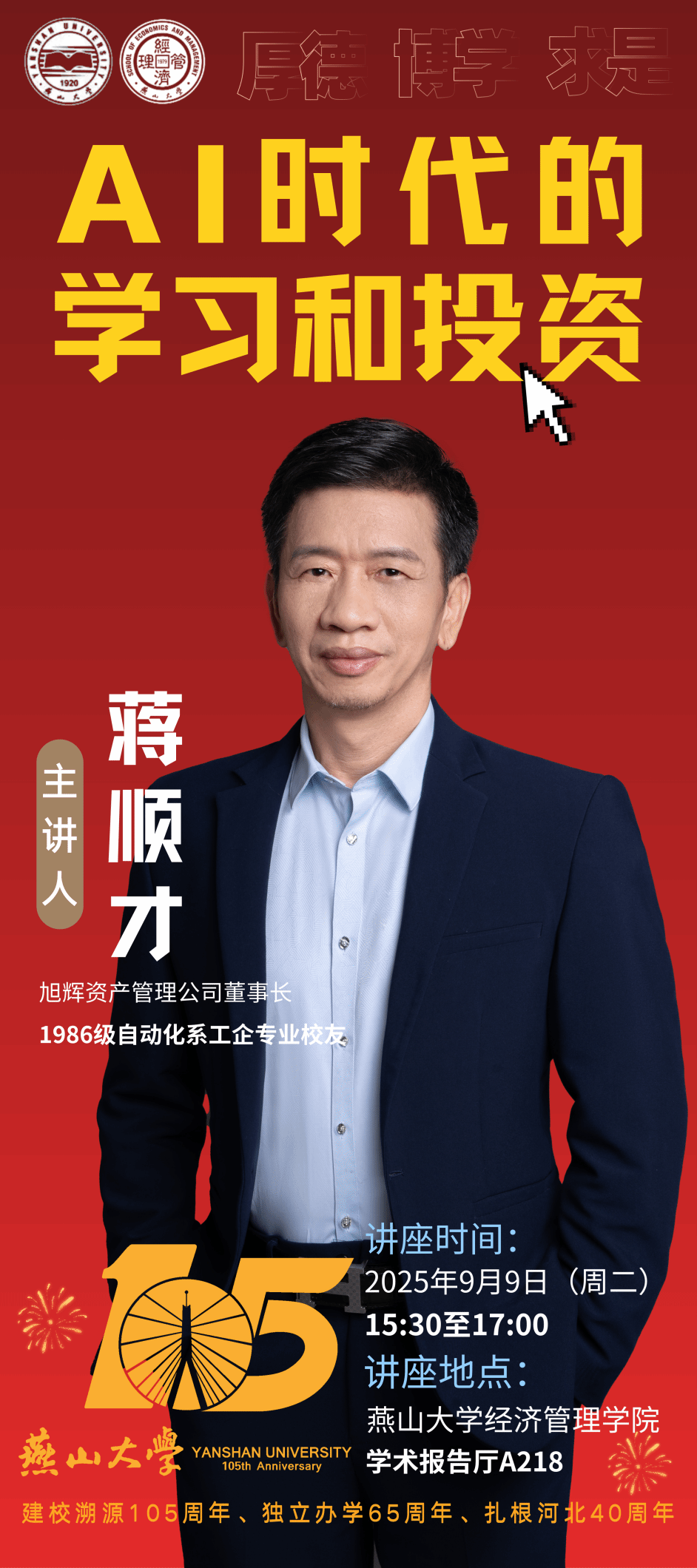建校溯源105周年、独立办学65周年、扎根河北40周年校庆之际,校友返校周系列活动再掀高潮。9月9日,杰出校友蒋顺才博士重返母校,在经管楼A218报告厅带来"AI时代的学习和投资"主题讲座,与全体燕大人共探AI浪潮下的成长机遇。众多校友慕名前来参会。讲座由经管宝威体育