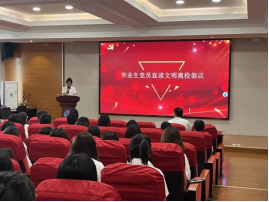 大会在庄严的国歌声中拉开序幕,随后毕业生党员代表高梦雪向全体毕业生党员们发出文明离校倡议。她倡议里离校期间遵守离校规定,让每一步都留下规矩与尊重的足迹;整理宿舍环境,让每一寸土地都充满整洁与温馨;文明参与活动,让每一个瞬间都充满欢笑与感动;传递正能量,让每一颗心灵都充满阳光与希望;留下美好回忆,让每一段旅程都充满色彩与温度;感恩母校教育,让每一颗感恩的心都充满敬意与感激。
