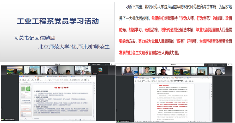 党委学习活动安排,工业工程系支部全体党员集中学习“习近平总书记给北京师范大学“优师计划”师范生的回信”,并展开讨论。