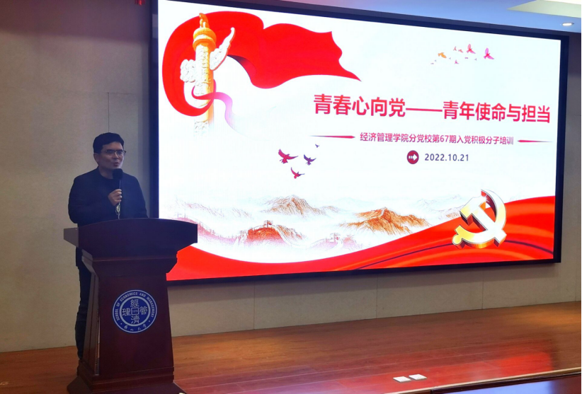 李迎家老师向所有参会人员讲述入党流程,向同学们强调了中国共产党对于党员的选定的严格要求。李老师指出,要成为一名合格的党员不仅要有家国情怀,还要持之以恒,不忘初心。尽管成为党员的时间很长,但是初心不能动摇,更不能放弃学业,要积极和老师进行沟通交流,坚持走正确的道路。