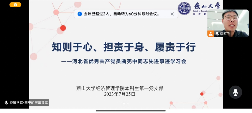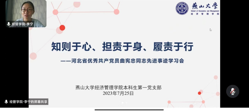 本科生第一党支部通过腾讯会议组织开展党员向曲宪忠同志学习活动,活动主题为“知则于心、担责于身、履责于行”,支部书记李宁老师、支部成员刘佳和李红飞积极参与,共同学习曲宪忠同志的先进事迹。