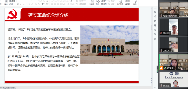 此次展示会的主题为《走进延安革命纪念馆》,由党员韩文星同学主持会议。展示会共分为“延安革命纪念馆介绍”、延安精神“、“游览感想”三个部分。在第一部分中,韩文星同学为我们介绍了位于延河畔的浓缩了13年红色风云的延安革命纪念馆,在生动的介绍下,一幅幅泛黄的历史照片、一段段厚重的史料文字、一件件质朴的实物仿佛出现在党员们面前。在第二部分中,韩文星同学为党员们介绍延安精神,延安精神是党在延安十三年凝结的宝贵精神财富,是伟大建党精神在延安时期的精神赓续,也是中国共产党人精神谱系的光辉篇章。在第三部分中,韩文星同学对游览感想进行总结:游览延安革命纪念馆时,我们了解到延安是中国革命的圣地,也是中国革命文化的重要源泉。这里保存着大量珍贵的历史资料和文物,使我们对中国革命历史和文化有了更加深入的了解。此外,在红军长征纪念馆里,展馆运用声光电等现代科技手段,增强陈列的动态效果,使人身临其境,我们看到了衣衫褴褛的红军跋山涉水历经千辛万苦到达陕北,党中央和毛泽东同志入驻延安,从此荒无人烟的陕北高原成为中国革命的摇篮,成为亿万优秀青年魂牵梦萦的圣地。展厅里的每个物件都在叙述红军壮丽的事迹和无畏的精神,我们感受到了中国革命的艰辛和无私奉献的精神,进一步了解了中国革命走向伟大胜利的历史进程。延安创造一个又一个的奇迹,创造了中国革命的奇迹,谱写了中华民族全新的历史!我们相信,在今后的旅行中,我们还会继续前往更多红色景点,去感知更多的历史和文化的魅力,去加深我们对中国的历史和文化有了更深层次的理解和认同。