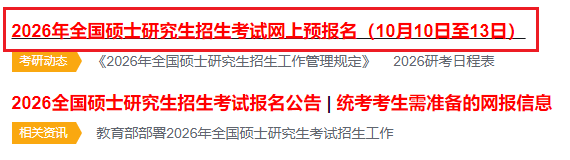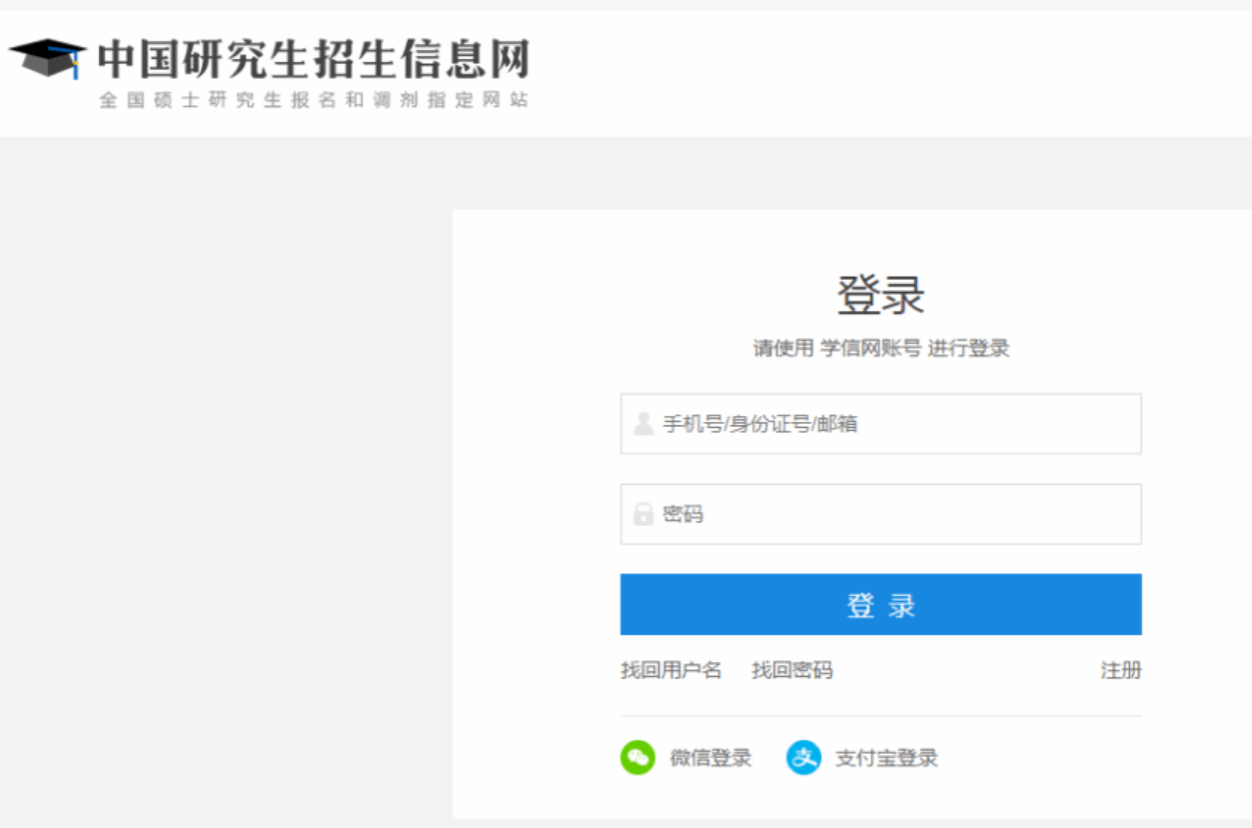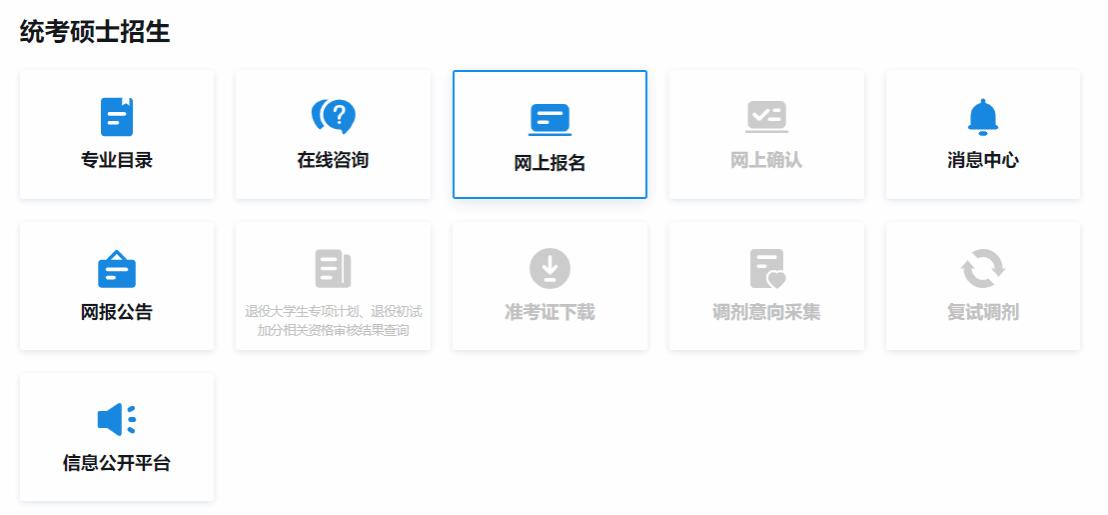 全国硕士研究生招生考试报名包括网上报名和网上确认两个阶段。所有考生均须在规定时间登录“中国研究生招生信息网”(简称“研招网”)()填报网上报名信息、网上支付报考费,并按照所选报考点要求进行网上确认。只有完成以上步骤,报名流程才完成。