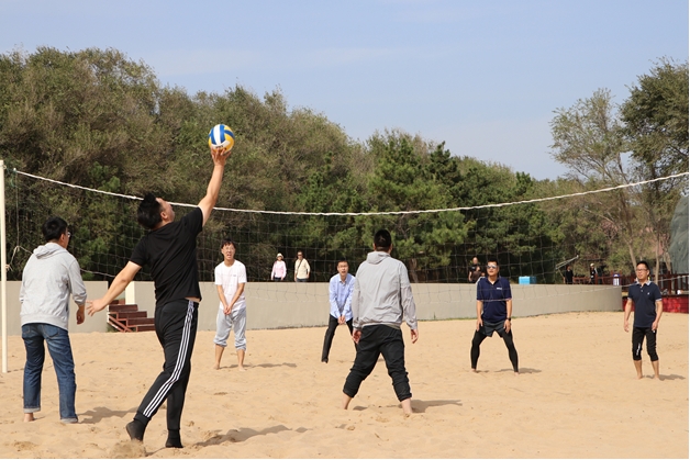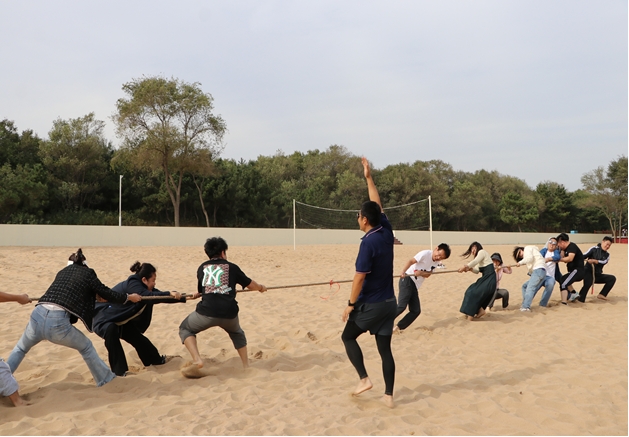 下午热身后,学员们在甬道和海岸间沙滩上积极参与竞赛项目——沙滩排球、沙滩足球、沙滩羽毛球、沙滩拔河、沙滩跳远。