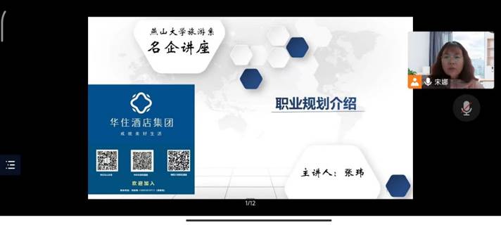 2022年11月17日,经管学院旅游系邀请华住酒店集团人力资源部校企合作负责人张玮先生为旅游系学子举行职业发展规划讲座。本次讲座由系主任宋娜老师主持,参会人员有华住酒店集团华北区域校企合作负责人刘浩先生,以及宝威体育